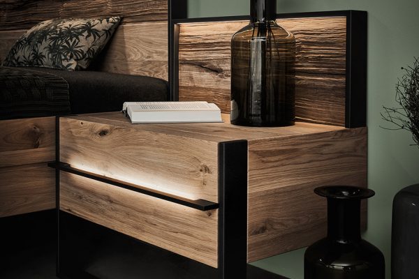 Spalt repräsentiert das traditionell von Hand geschlagene Spaltholz mit seiner markanten Struktur, die durch Spalten entlang der Holzfaser entsteht. Durch die Verprägetechnik ist Spalt als großformatige Platte erhältlich und nicht in kleinen Riegeln, wie herkömmliches Spaltholz.